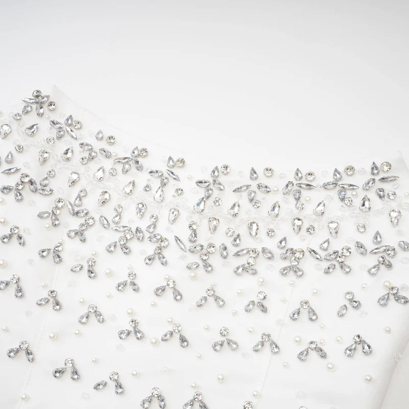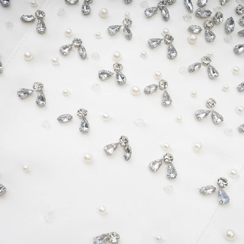 Al adquirir el vestido Melisande, aceptas que las perlas y los cristales están aplicados artesanalmente uno a uno. La ligera pérdida o rotura ocasional de una cantidad mínima de estos elementos puede considerarse un fenómeno normal, incluso en prendas de marcas de alta gama o lujo.